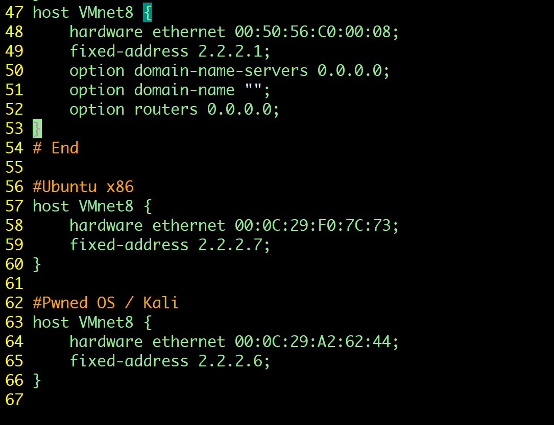 The #Ubuntu is a comment for me to identify which virtual machine has that Mac Address, And IP Address, Just add the Mac Address of the Virtual Machine you wish to set a Static IP Address for by going to Vmware Workstation / Player, Settings > Network Adapter > Advanced There you will see the MAC Address And Copy, Then Edit The Fixed Address With How You Configure Your NAT.